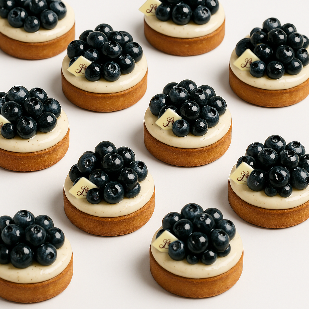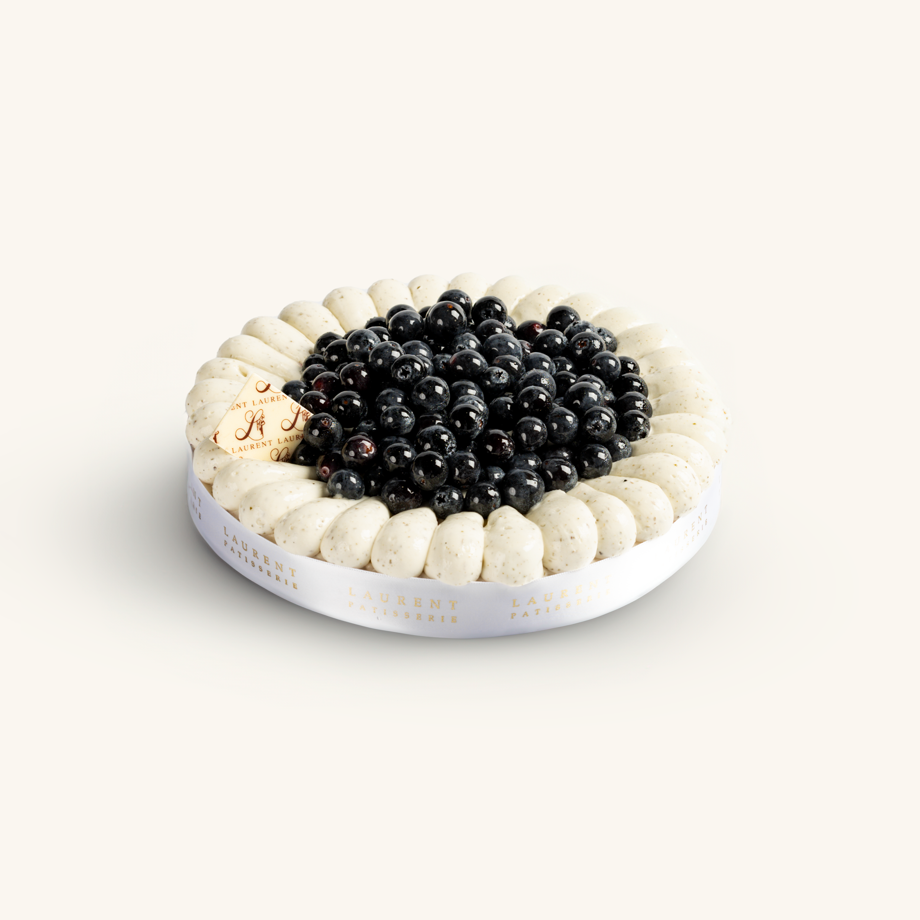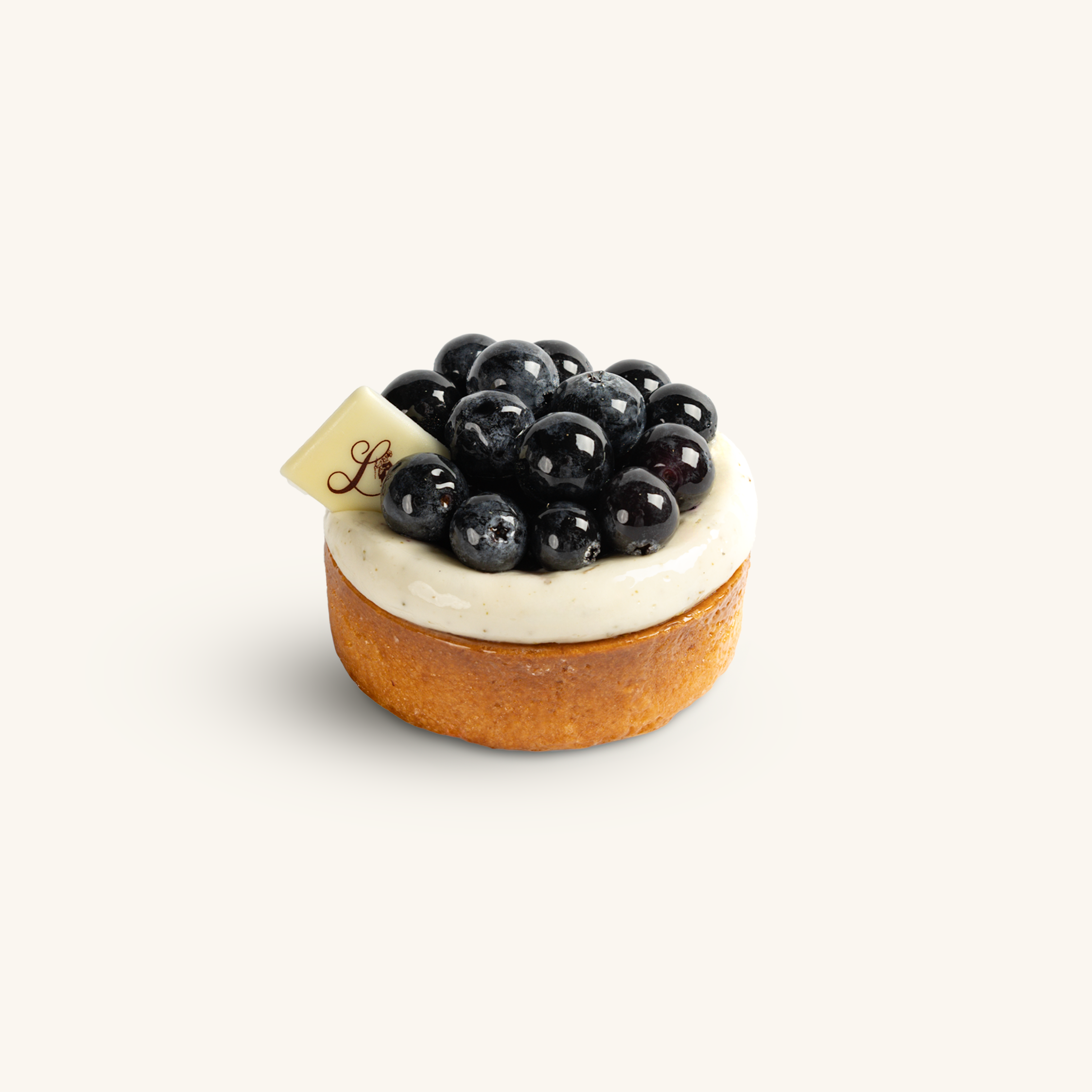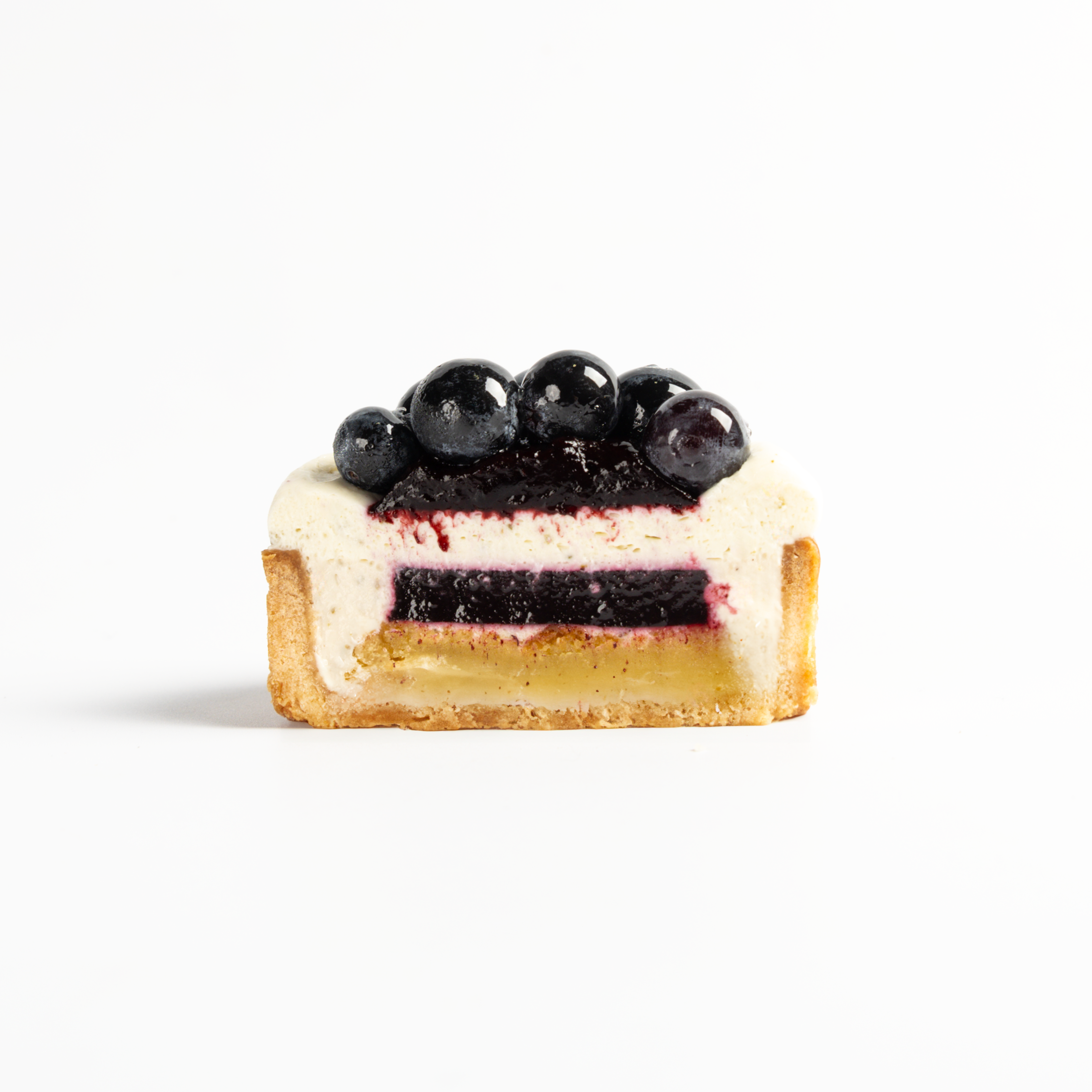 A shortcrust shell with almond creme filled with blueberry jelly and Lemon Myrtle cream, topped with whipped ganache and fresh blueberries