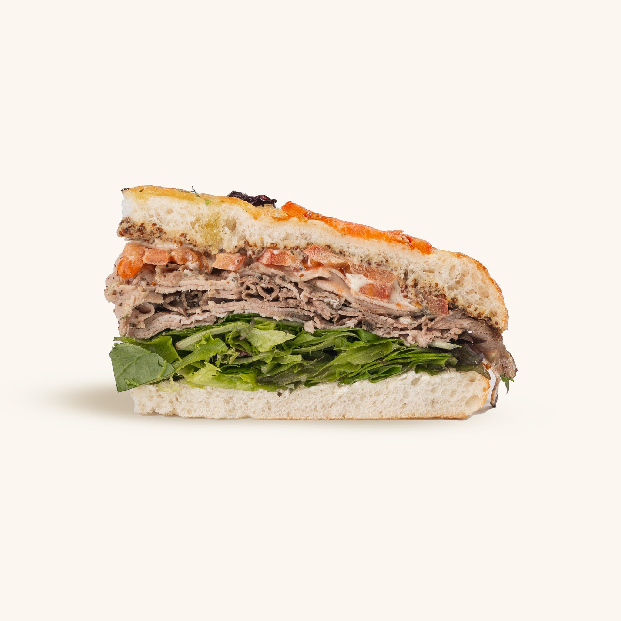 Roast beef, tomato, lettuce, horseradish dressing, butter, wholegrain mustard, pepper