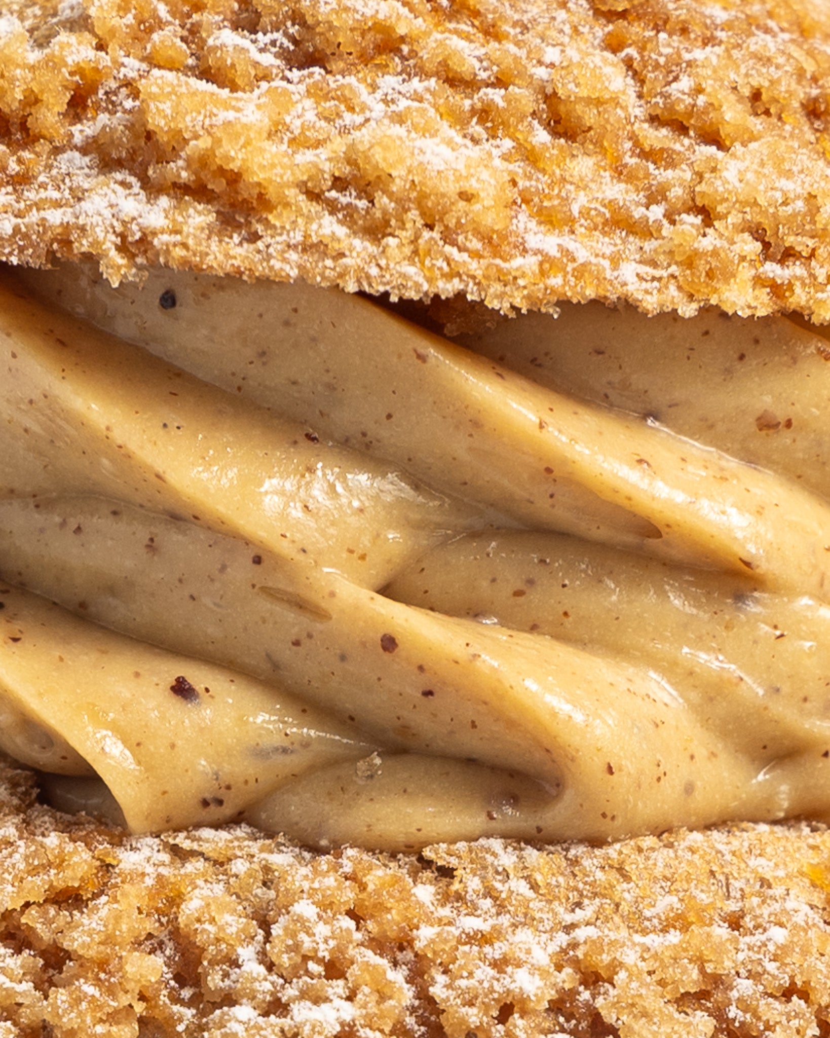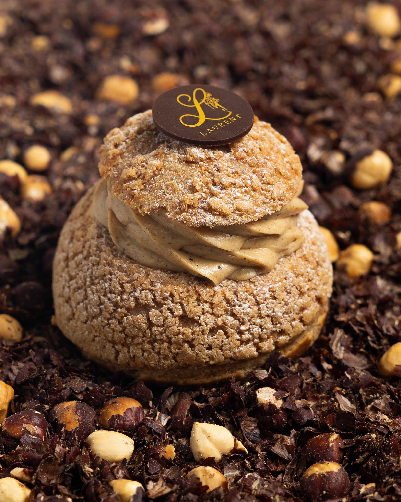 Choux pastry filled with a milk chocolate hazelnut crunch, followed by apple & cinnamon compote and topped with a smooth praline hazelnut cream.