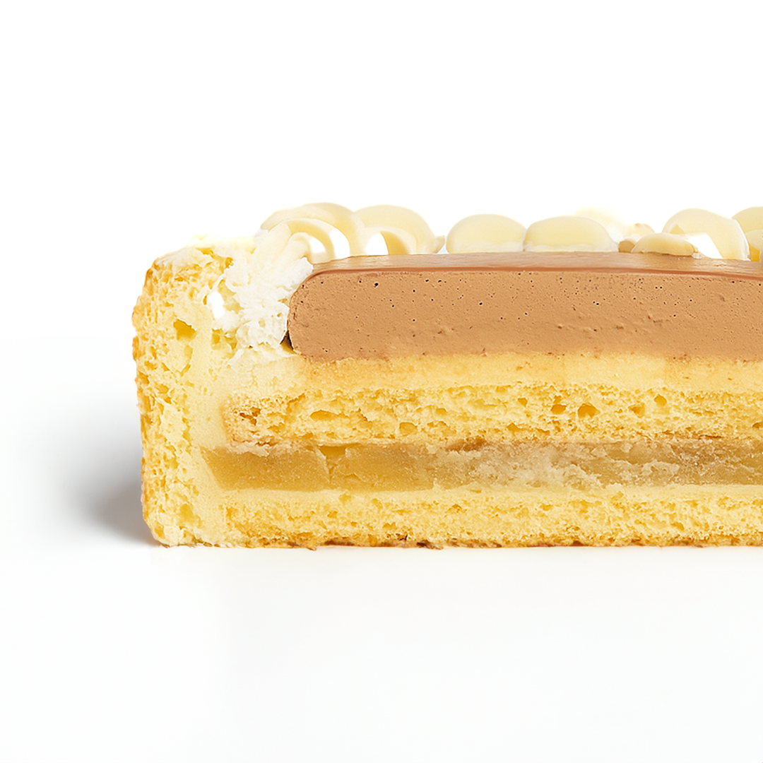 Soft biscuit cuillère layered with pear mousse, pear jelly, and a smooth chocolate glaze.
