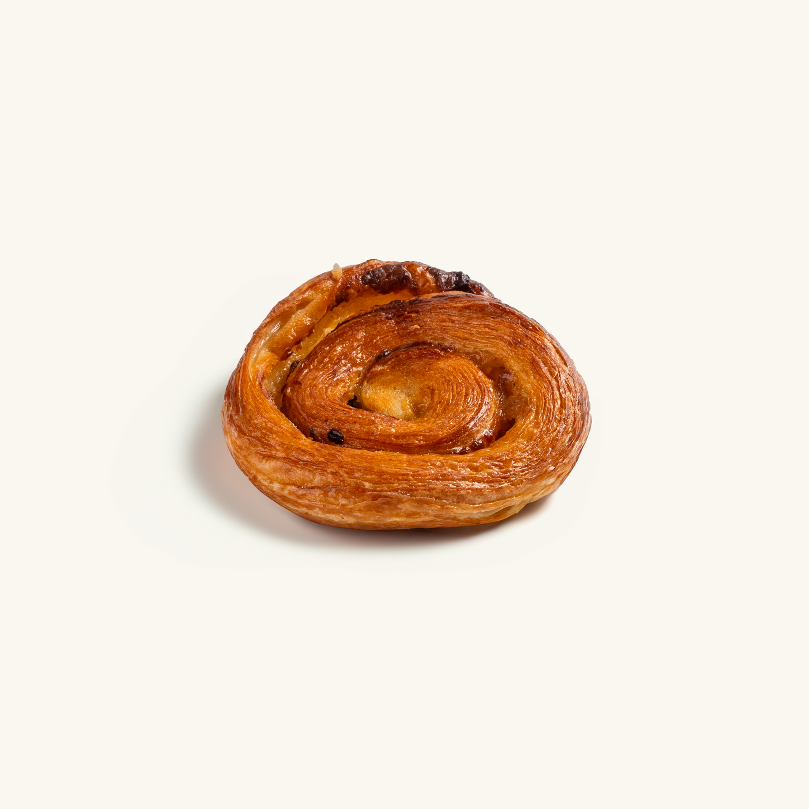 A traditional French escargot with laminated danish dough rolled with vanilla creme patissiere and Rum raisins.