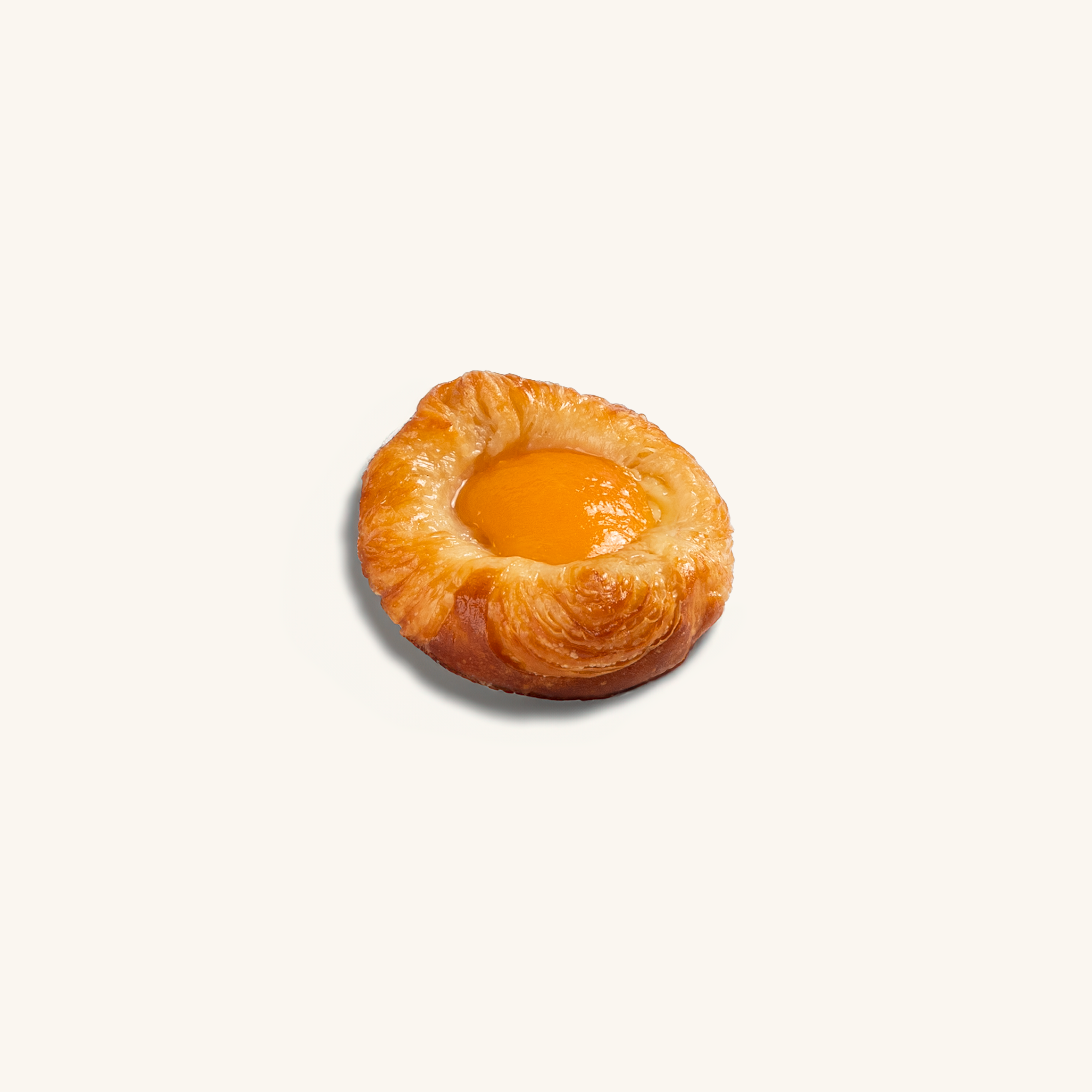 A baked danish filled with vanilla creme patisserie and topped with apricot