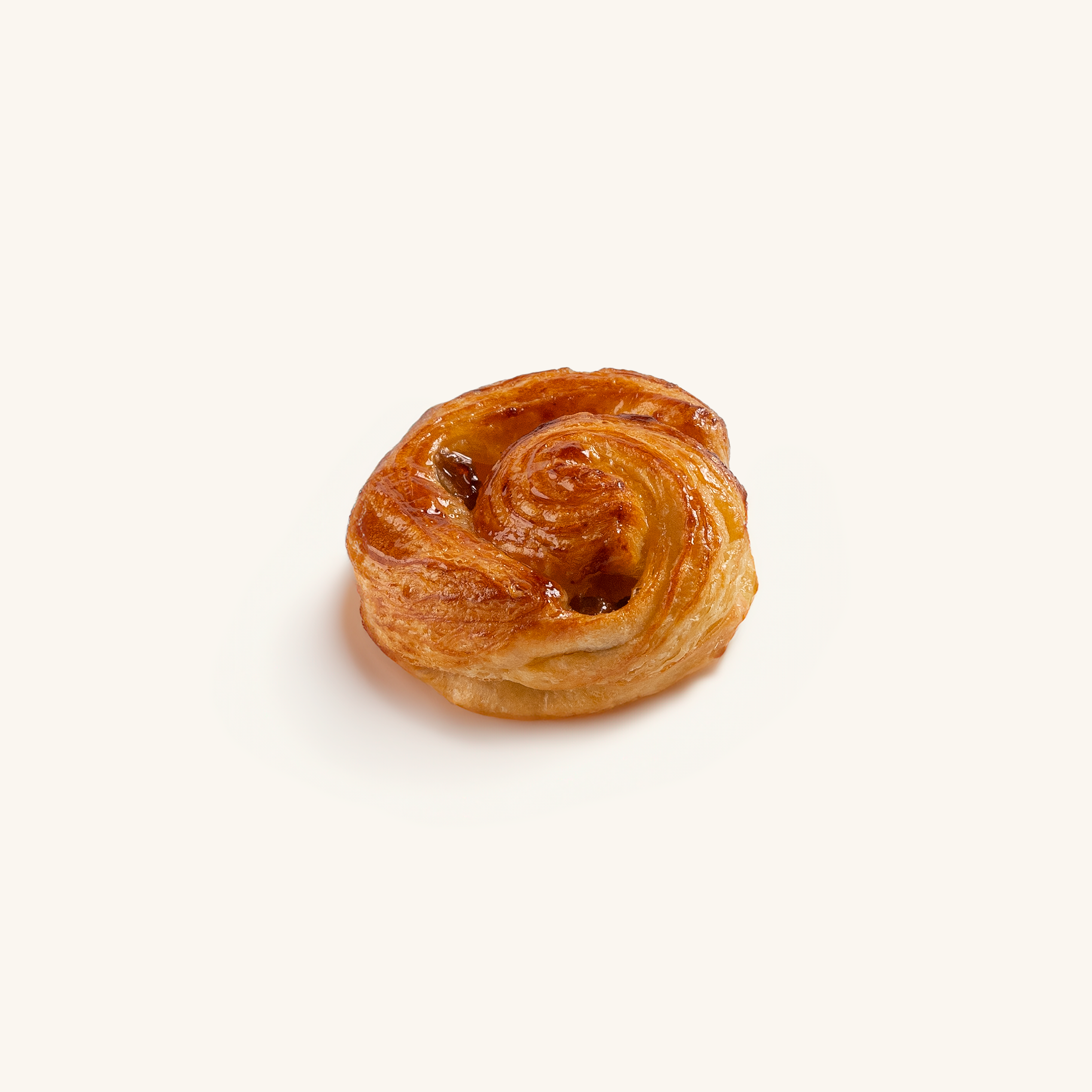 A traditional French escargot with laminated danish dough rolled with vanilla creme patissiere and Rum raisins.
