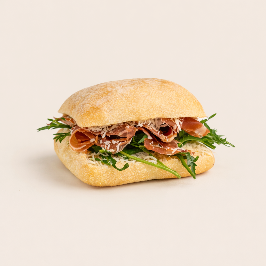 Sourdough ficelle baguette with rocket mixed with extra virgin olive oil, prosciutto, pecorino cheese & white truffle oil